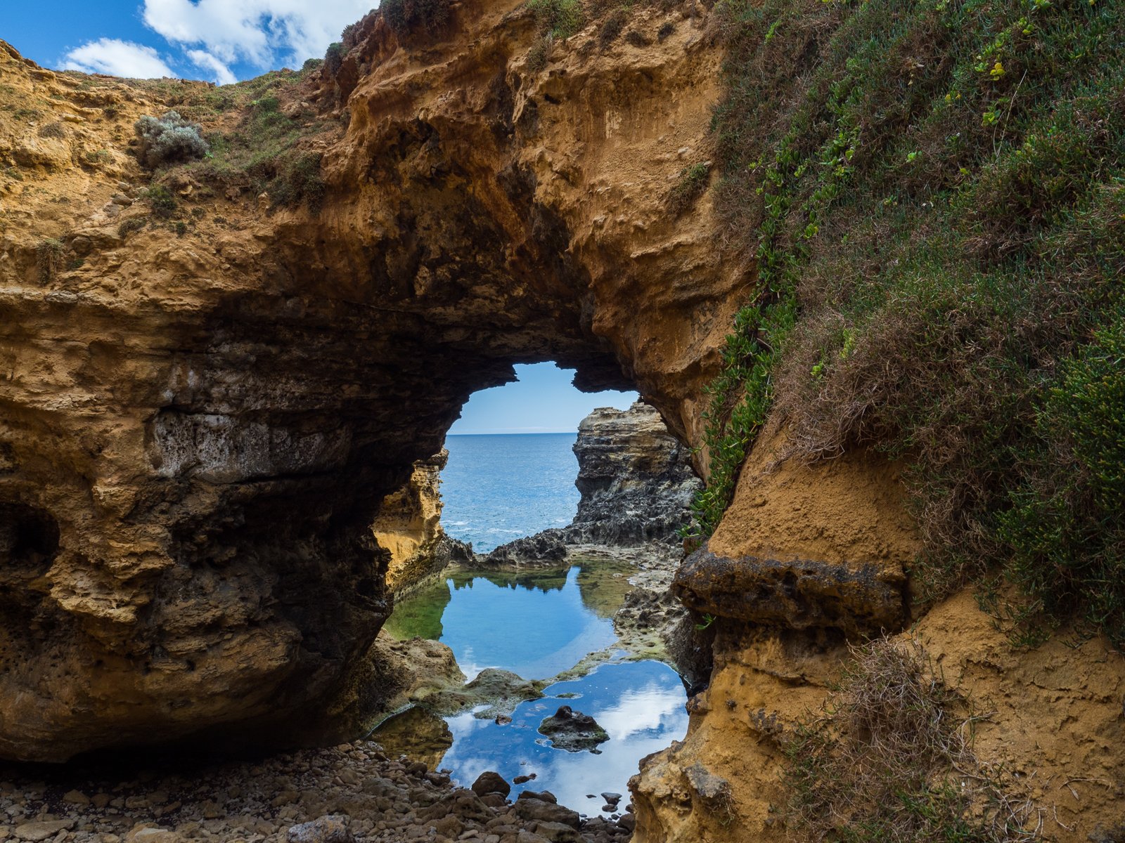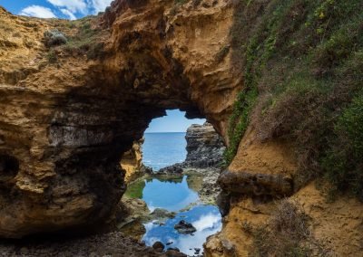 The Grotto is located 9km west of Port Campbell. It is an interesting formation, that is a blowhole when the weather is severe. Normally it is an interesting archway, and partly a cave. You can walk down to the bottom of the formation and you get an incredible site of viewing the horizon through the opening.