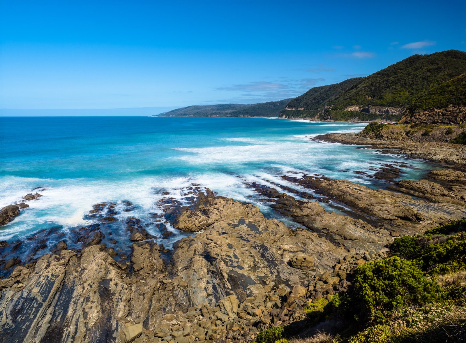 The road reaches a height of 100 metres above sea level, providing specular views of the Otway Ranges as it meets the sea. The ranges are covered in thick forest.