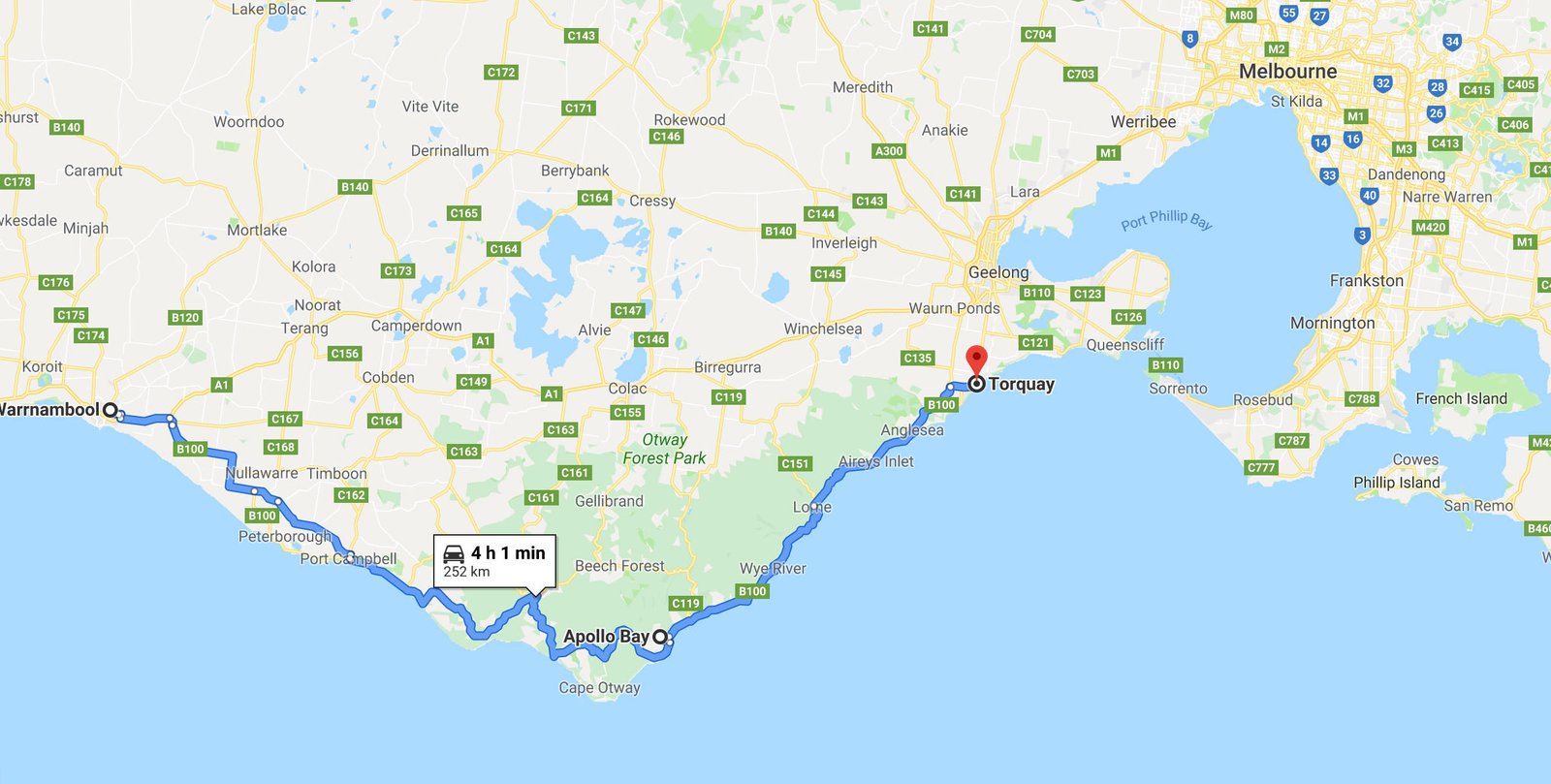 It starts at the beachside town of Torquay and finishes after 230Km just to the east of Warrnambool. It officially is known as B100.