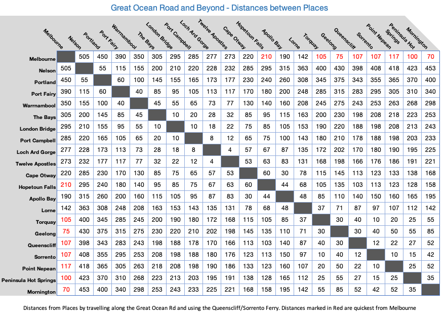 Places to stay along this coastline are Lorne and Port Campbell, and if you stay longer you may wish to include a favourite spot along the coastline from Apollo Bay to Wye River.
